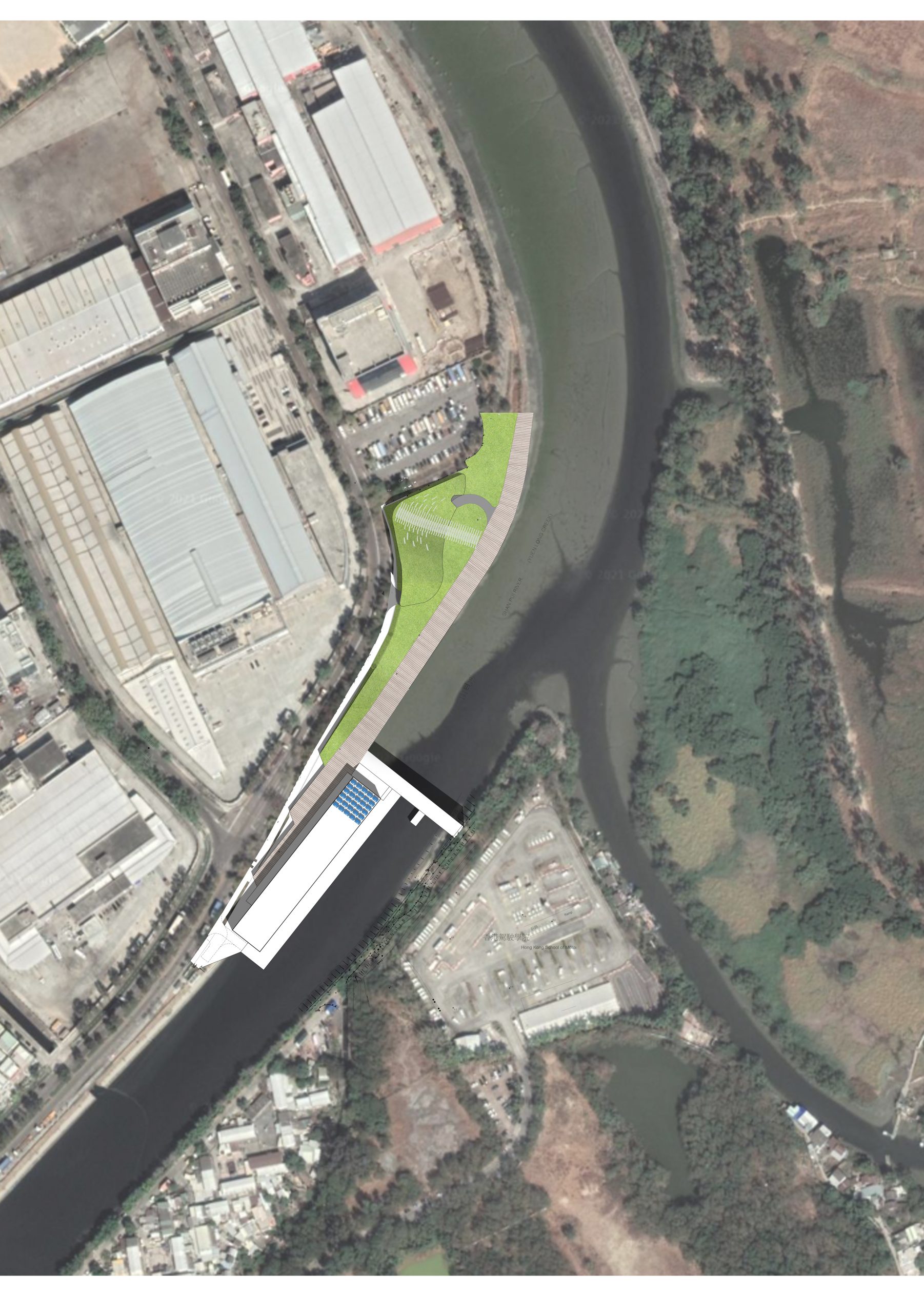 Located along the Yuen Long Nullah, the Yuen Long Barrage Scheme is implemented to relieve flood risks within the area, with structures including a pumping station, a barrage and Main Control Centre. Taking on the challenge of acting as a physical linkage between the nearby industrial area and the environmentally sensitive Nam Sang Wai wetlands, smooth integration will be achieved through the promotion of both serviceability and leisurely public enjoyment on site. In the view of the environmentally sensitivity and difficult geotechnical profile of Schedule 2 area of the Site, the Main Control Centre will be camouflaged into the thick blanket of lawn with extensive green roofing as viewing patios towards the wetlands. Together with public piazza at street level and a broadwalk connecting the riverfront, allowing better connectivity and accessibility between north and south, east and west of the Yuen Long River.
